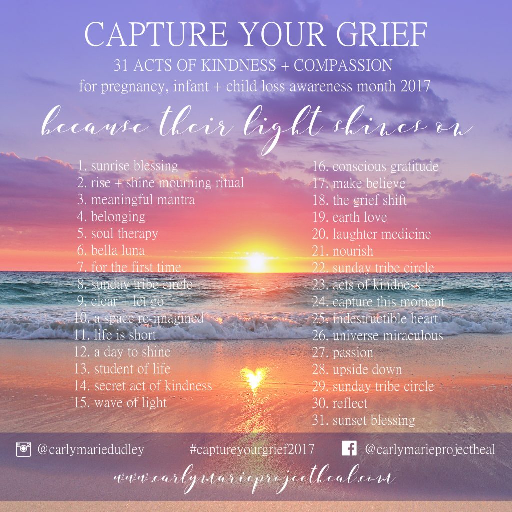 Het thema is ‘Their Lights Shines On’, hun lichten blijven schijnen. En in oktober wordt je aangemoedigd om verschillende lieve daden te doen. Iedere daad/dag zal bijdragen aan jou eigen bewustzijn over je verlies, maar ook verbinden met anderen die hier aan mee doen.